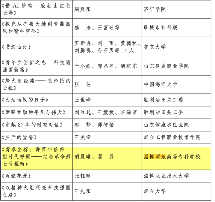其中,胡晨曦老师凭借其指导的《尽善尽美为解放——缅怀革命烈士王尽美》荣获优秀指导奖,其个人作品《青春坐标:讲百年信仰 担时代脊梁》同时获得三等奖。高纤铷老师的《故乡寻迹 叩问初心——焦裕禄三封入党申请书的故事》、孙金莹老师的《铮铮誓言家国情 巍巍丰碑立铁山》以及王雪老师的《旧业革新春景焕新城筑梦韵悠长——党的二十届三中全会精神的淄博实践》三部作品荣获优秀风尚奖。